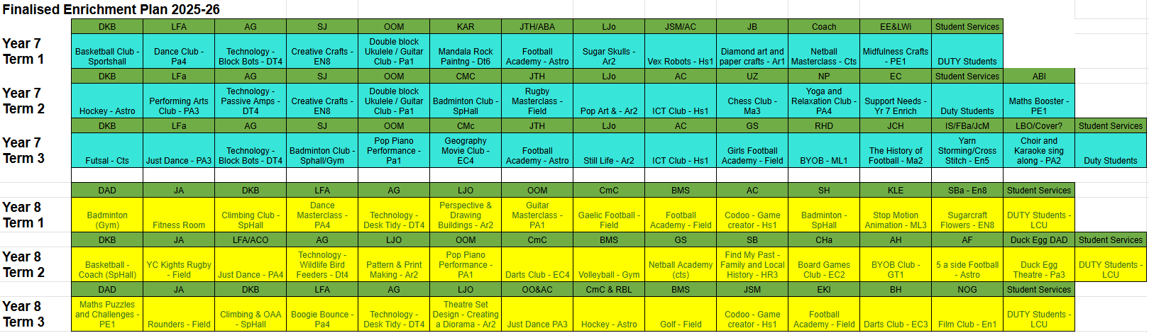 Across years 7 to 10 the choice of activities available offers opportunities for students with a wide breadth of interests as well as offers a chance to be involved in activities that are not available within the core curriculum. Below are the enrichment clubs running for 2024-2025.
